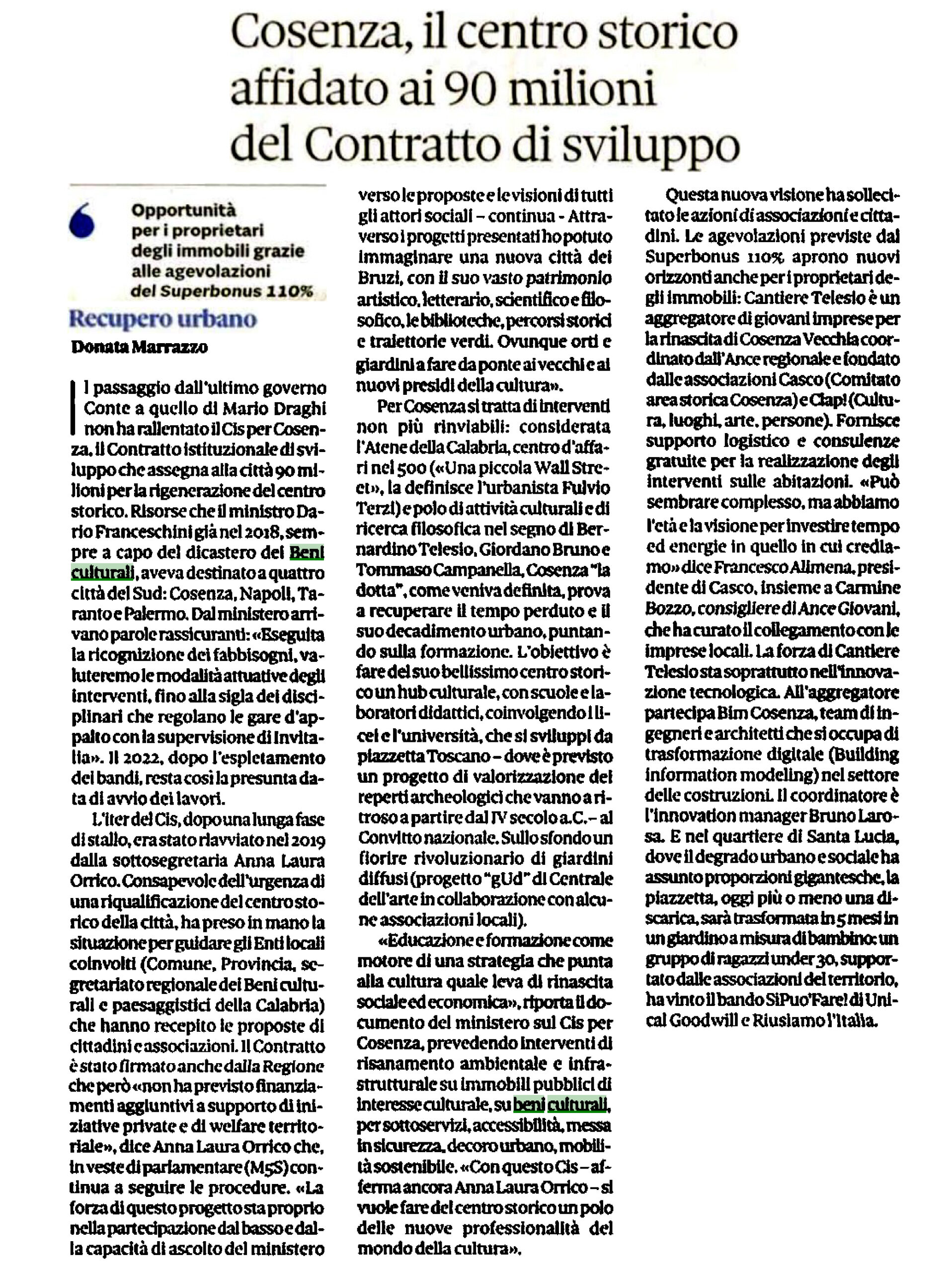 Il Sole 24 Ore intervista la deputata del M5s Anna Laura Orrico che, durante la sua esperienza di governo con il Conte Bis, da Sottosegretario ai Beni e alle attività culturali con delega ai Cis aveva portato a termine la procedura dei quattro Contratti di Sviluppo di competenza del Ministero della Cultura. In particolare la discussione si dipana sul centro storico di Cosenza di cui la deputata è originaria. “Educazione e formazione – dice in merito Orrico – come motore di una strategia che punta alla cultura quale leva di rinascita sociale ed economica”.